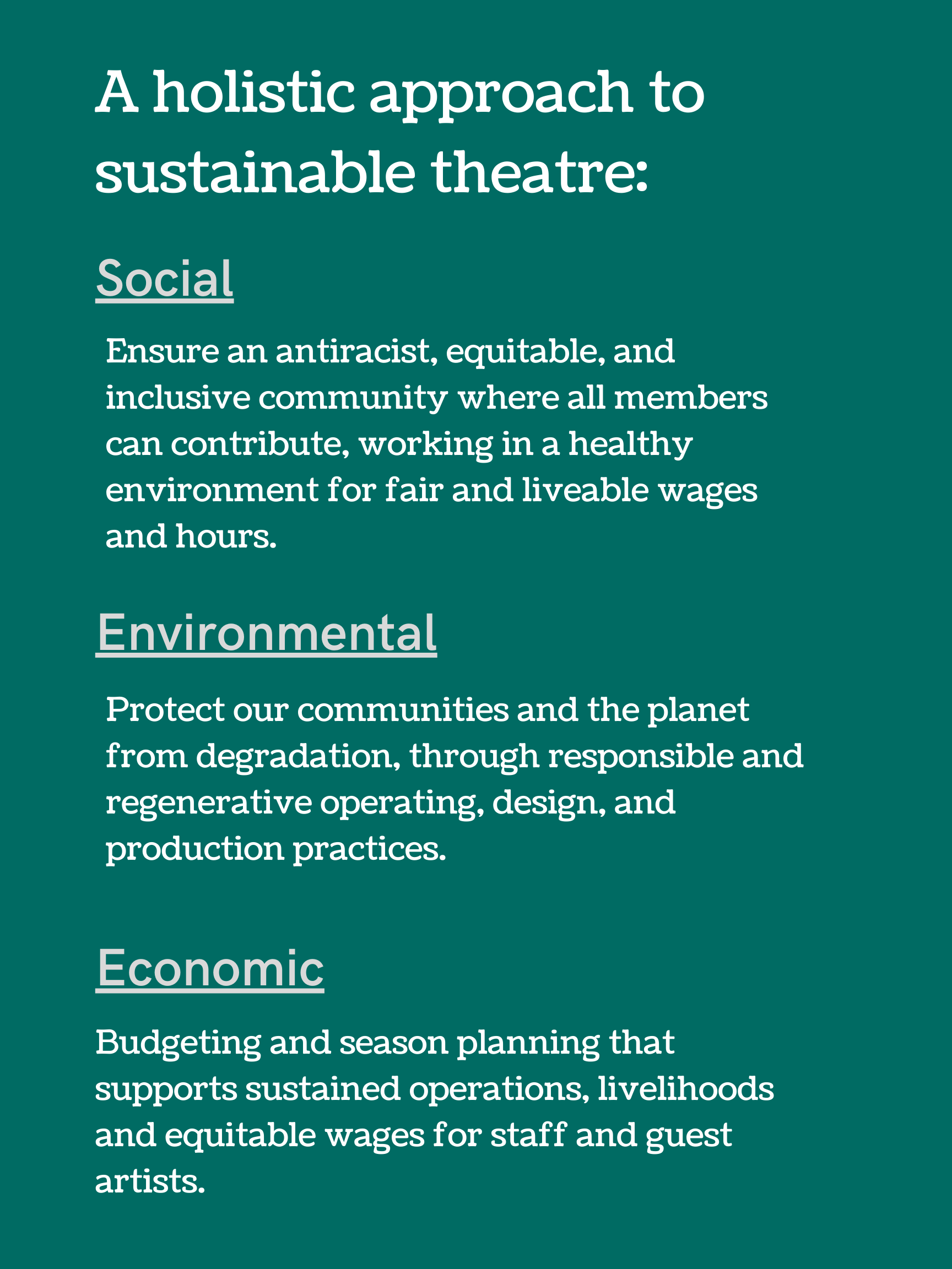 This is a guide with concrete tools and best practices for prioritizing the intertwined needs for greater environmental, social, and economic sustainability in our industry. Our focus here is on environmental sustainability tools, especially for design and production, but we recognize the need for a broader conversation and invite the creativity and wisdom of our colleagues across the country in re-imagining American Theatre.